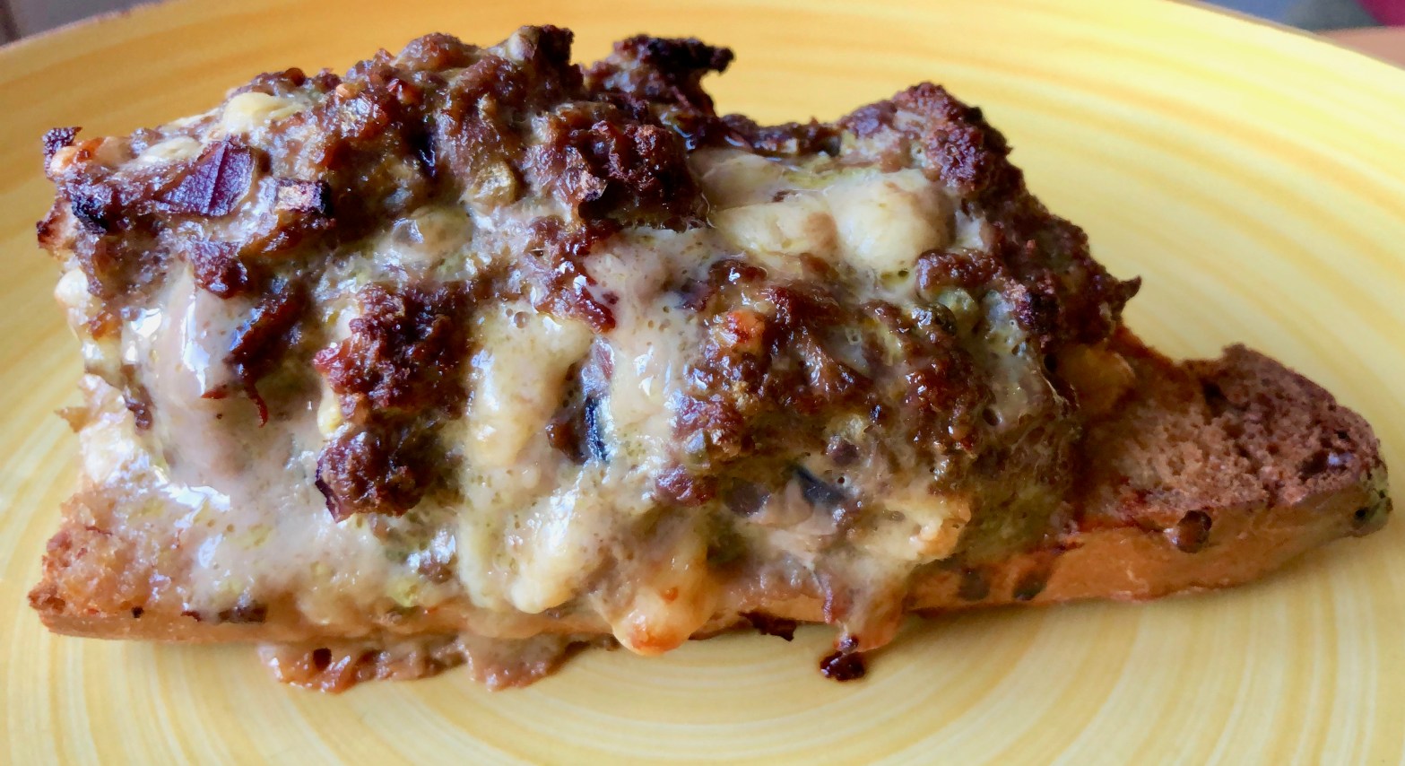 Vor vielen Jahren hatte WDR-Radiokoch Helmut Gote ein tolles Rezept für eine herzhafte Mahlzeit mit Hackfleisch: das Bottroper Mettbrötchen. Ich habe es natürlich umgewandelt und mache es mit Wildhack, gestern Abend mit Rehhack. Ein Baguette, es geht auch prima mit Brötchen vom Vortag, hatte ich noch im Froster und schon vorher rausgeholt. Ins Hack kommen neben Pfeffer und Salz noch ein Ei, kleingeschnittener Bergkäse, und rund ein Esslöffel zerhackte grüne Pfefferkörner. Die Hackmischung auf´s Brot und im vorgeheizten Backofen bei 200 Grad 20 Minuten garen.