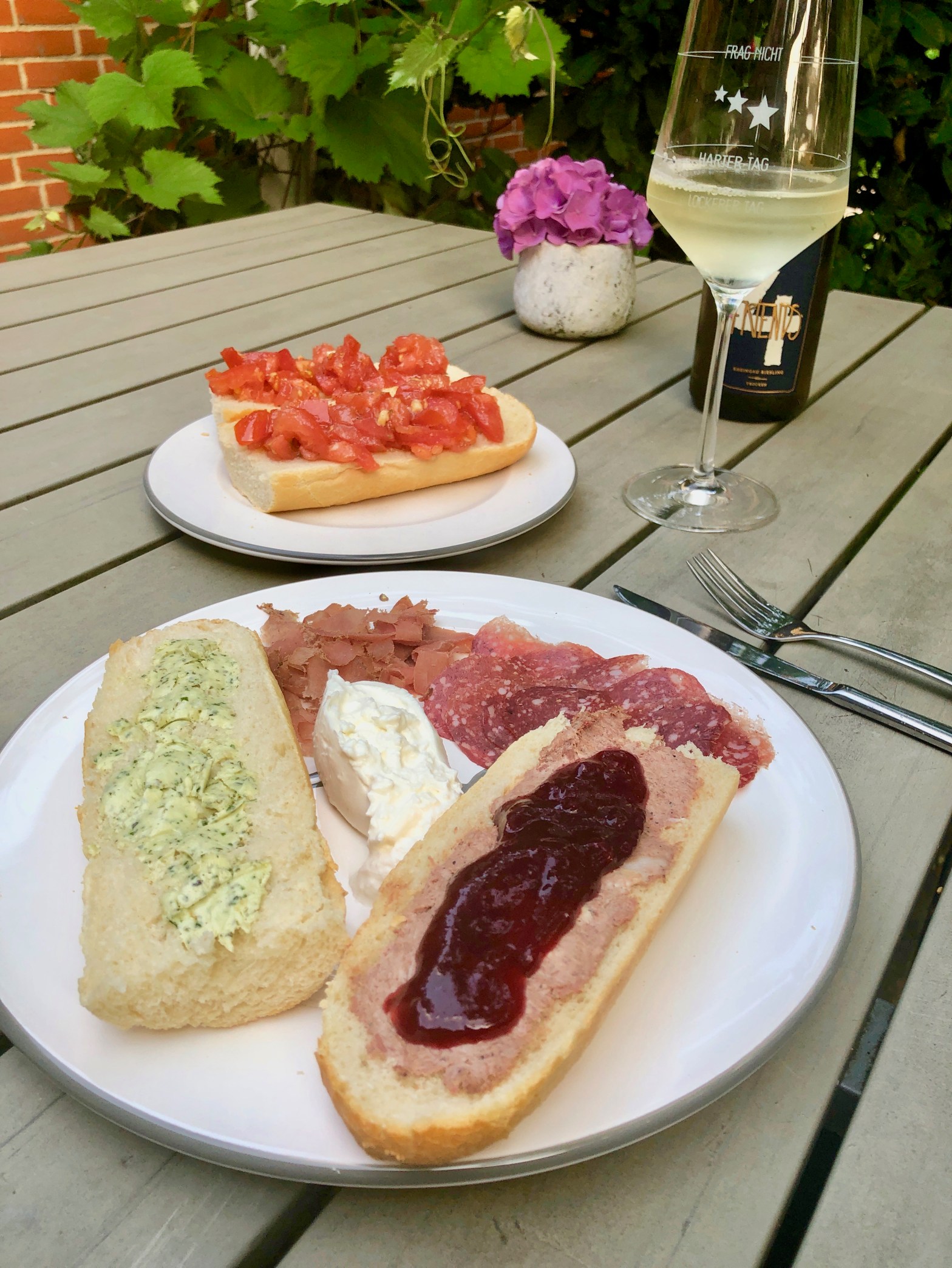 Ein Abendessen mit Zutaten aus Revier und Garten ist schnell gemacht: Wildschweinsalami, selbst geräucherter Rehschinken, selbst gemachte Wildschwein-Leberwurst mit Johannisbeer-Zwiebel-Chutney, dazu etwas Burrata, Baguette, Kräuterbutter, Bruschetta mit den ersten Tomaten aus dem Gewächshaus – dazu ein Rheingau-Riesling – was will man mehr?