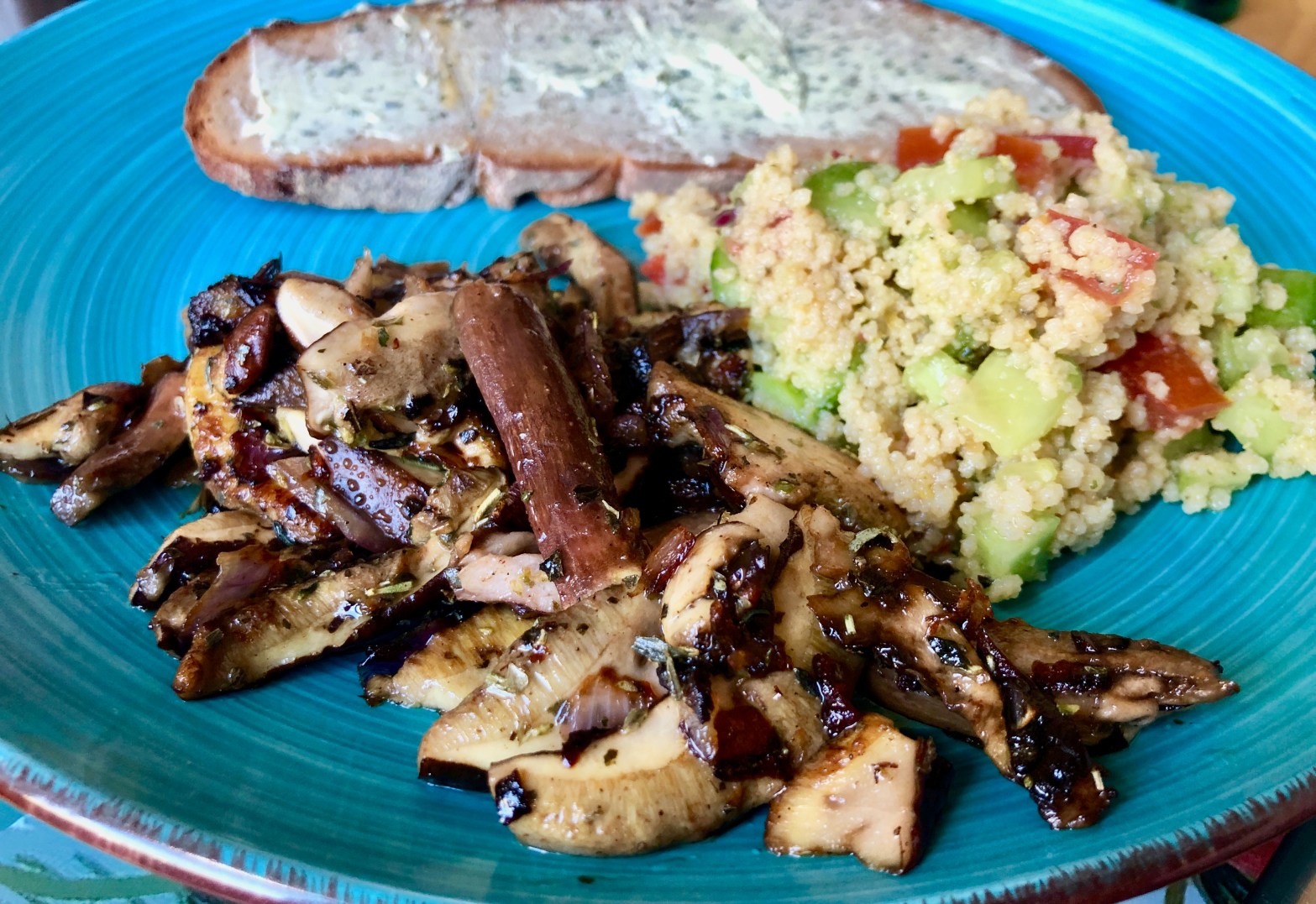 Gestern Abend noch schnell eine Schweißfährte für den Hundenachwuchs in einem kleinen Wäldchen gelegt und über die ersten Rotfußröhrlinge gestolpert. Ein Speisepilz, der in unserem waldarmen Revier häufiger nach Niederschlägen zu finden ist. Also ab in die Pfanne mit Wildschweinschmalz und roter Zwiebel gegart. Dazu gab es ein Roggenmischbrot mit Kräuterbutter unserer örtlichen Molkerei und Couscous-Salat, den ich im Sommer fast immer im Kühlschrank habe, dank eigener Tomaten und Gurken. Couscous-Salat ist sehr einfach: Couscous mit Brühe quellen lassen, Olivenöl dazu, ein paar Spritzer frische Zitrone oder Limone, Salz, Pfeffer, kleingeschnittene Tomaten und Gurken, Petersilie – fertig.