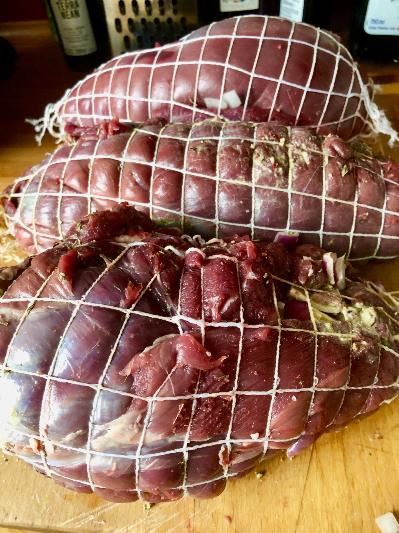 Die #Staghunters waren erfolgreich zur Blattjagd zu Gast bei uns. Also gibt es jede Menge Rehwild zu verarbeiten. Im Netz hatte ich kürzlich einen Outdoor-Cook gesehen, der von einer Rehkeule eine Riesen-Roulade gedreht hatte. Das habe ich jetzt mal nachgemacht. Dazu die Rehkeule entbeinen, aufklappen, mit Salz und Pfeffer würzen. Mit Senf bestreichen, darauf Speck vom Wildschwein verteilen. Eine grob gewürfelte Zwiebel in die Mitte geben und Streifen vom Käse (ich hatte nur Gouda und Bergkäse da, im Original nutzte der Koch auch Cheddar). Das Ganze mit der Mischung Italienische Kräuter von #Ankerkraut kräftig bestreuen und zusammendrehen. Statt Bindfaden habe ich die Riesen-Roulade (oder auch Rollbraten) ins Netz verfrachtet (das geht einfach mit einem großen Rohr: das Netz darüber stülpen. So bekommt man den Braten elegant ins Netz ohne große Zupferei). Die fertigen Bratenstücke werden nun eingefroren. Das Ergebnis nach dem Garen dann später mal an dieser Stelle.