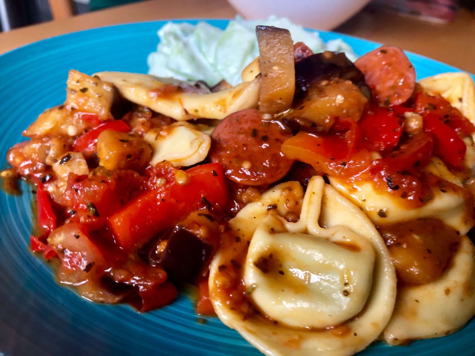 Man hat ja nicht immer Zeit und Lust, lange in der Küche zu stehen. Da greife auch ich auf Fertigprodukte wie gefüllte Tortellini zurück. Dazu einen Soße aus kleingeschnittenen Wildkrakauern, selbstgemachter Tomatensoße, Gemüse was gerade da ist, hier Aubergine und Paprika aus dem Gewächshaus, noch ein paar frische Tomaten dazu und alles etwas köcheln lassen. Zusammen mit den Tortellini und einem erfrischenden Gurkensalat servieren – das geht in weniger als 15 Minuten! Guten Appetit!