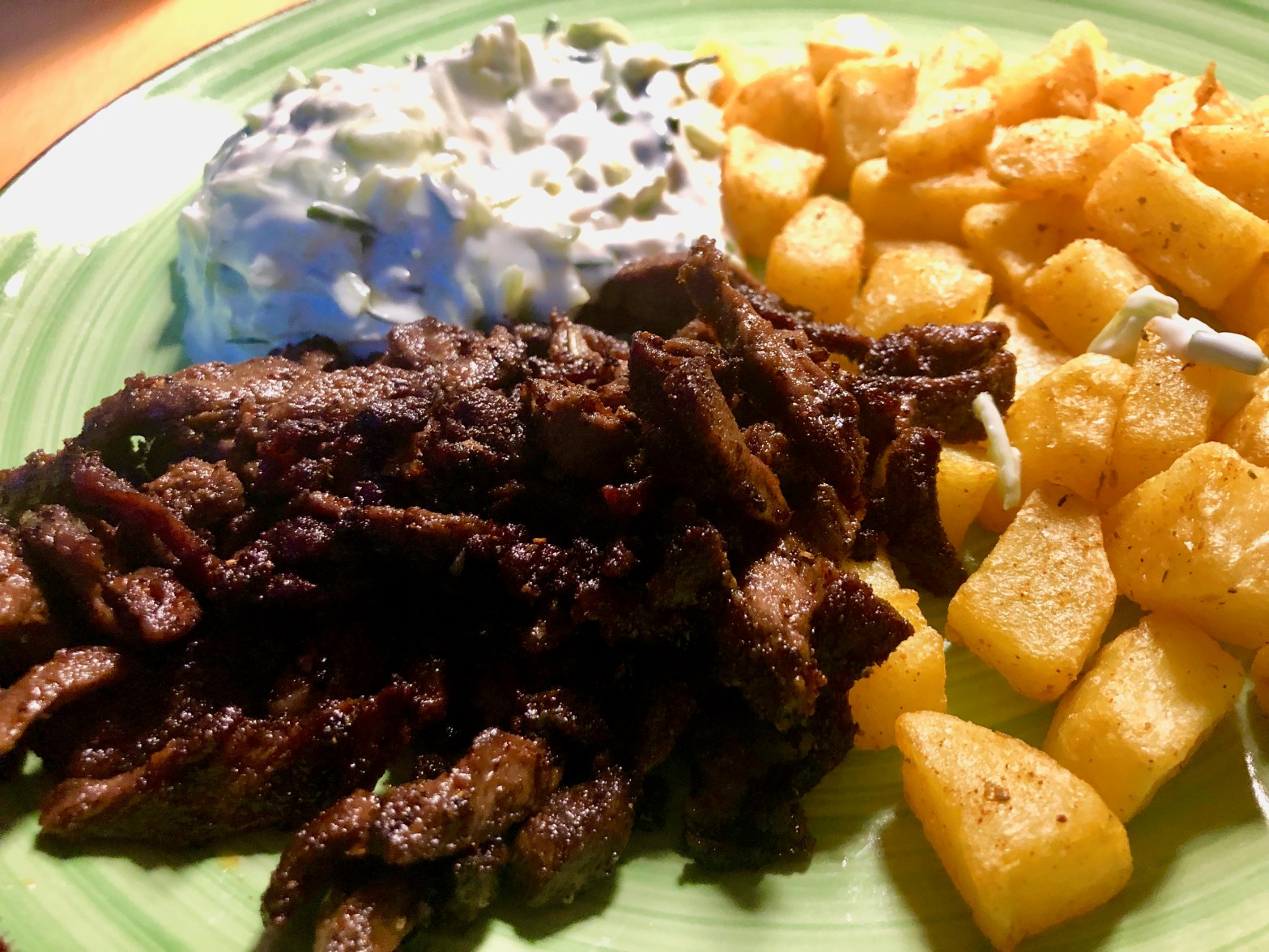 Gyros vom Reh haben wir im Sommer bereits in einer größeren Menge hergestellt und eingefroren. Da noch ein paar Gurken im Gewächshaus reiften war schnell klar: Gyros auftauen und Tzatziki dazu machen. Gesagt getan. Wie das Gyros produziert wird, findet Ihr in den Rezepten. Dazu gab es noch Bratkartoffelwürfel aus der Actifry.