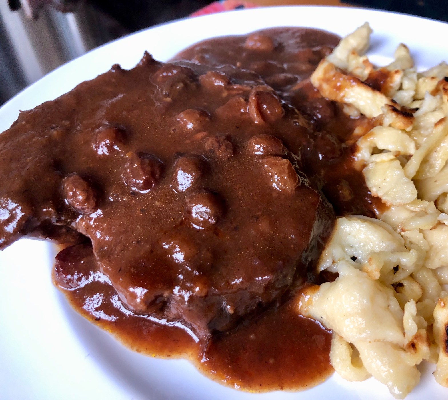 Sauerbraten – das ist eine Hommage an die Heimat – und natürlich sind für einen Rheinländer die Rosinen ein MUSS! Man kann sie – rein theoretisch – aber auch weglassen. Eine Wildschweinkeule wurde zur Vorbereitung also mehrere Tage eingelegt. Für den Sud Möhren und Ingwer, Knoblauch und Zwiebeln klein schneiden. Gemüsewürfel mit Lorbeer, Thymian, Pfefferkörnern, Piment (die Gewürze am Besten in einem separaten Beutel), Rotweinessig, Rotwein, Wasser, etwas Zucker und Salz aufkochen, abkühlen lassen. Die Keule mit dem kalten Sud übergiessen und ca. 2 bis 3 Tage marinieren lassen. Dann aus der Marinade nehmen, abtupfen und in heißem Öl anbraten. Die Marinade derweil durch ein Sieb gießen. Die angebratene Keule herausnehmen, Tomatenmark im Topf anrösten und dann das aufgefangene Gemüse wieder zufügen, mit gut der Hälfte der Marinade ablöschen. Die Keule reinlegen und ca 2 Std. schmurgeln lassen. Immer mal wieder Marinade nachgießen, so dass die Keule gut zwei Drittel bedeckt ist. Schließlich die Keule wieder rausnehmen und warm stellen. Die Soße nun püriere, Vanillemark und dunkle Schokolade zugeben, etwas einkochen lassen, zum Schluss Rosinen zufügen. Die Keule aufschneiden und das Fleisch in Scheiben in die Soße legen. Nun kann serviert werden. Bei uns gibts dazu gerne Spätzle.