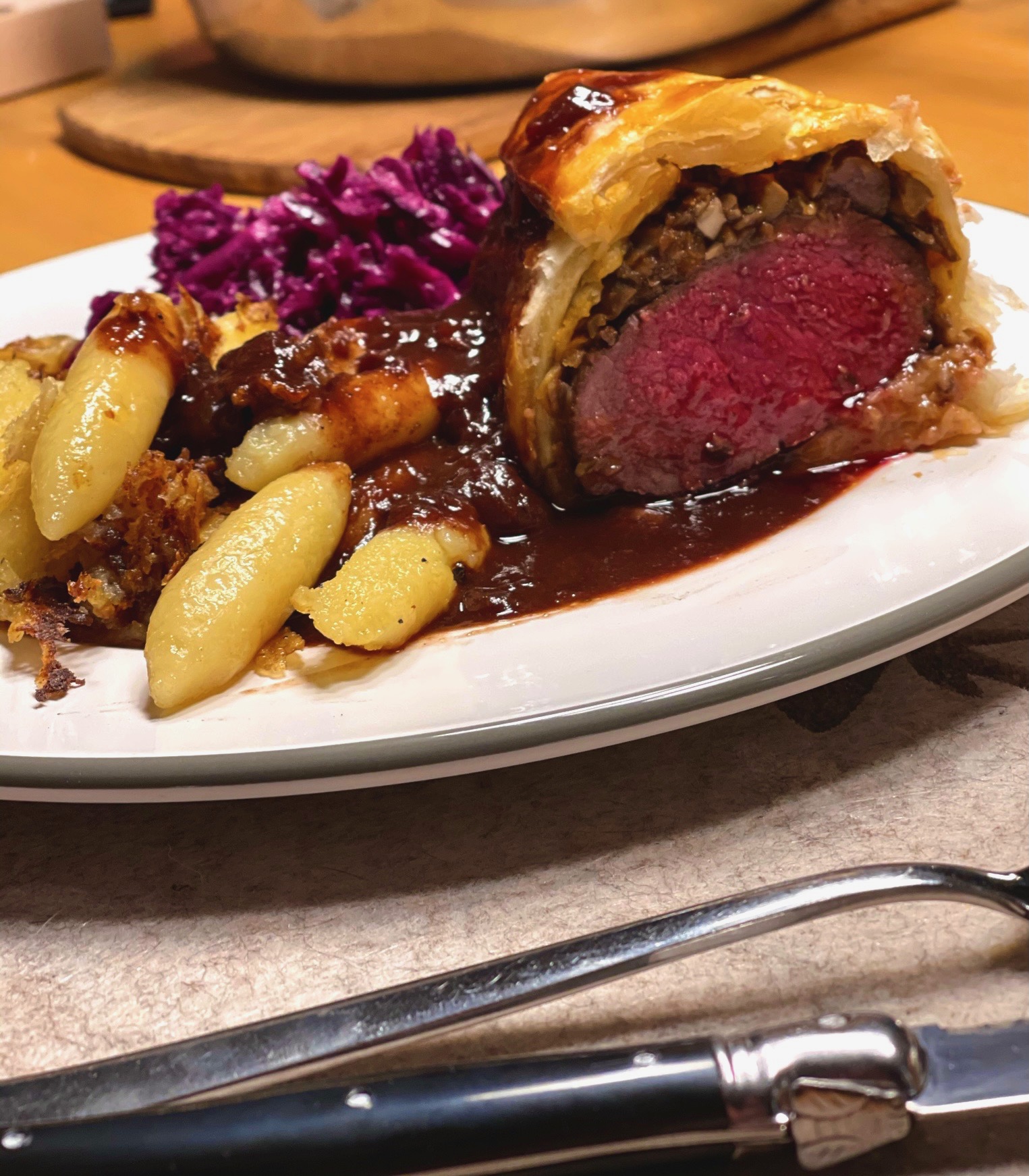 Auf ganz besonderen Wunsch gab es Heiligabend bei uns Rehfilet Wellington. Das habe ich ewig nicht mehr gemacht und von daher war auch ich sehr gespannt, wie das Ergebnis beim Anschnitt aussah. Was soll ich sagen? Ihr seht es ja selber – es war perfekt und so lecker, dass eine Wiederholung schon bald geplant ist. Denn es hat einen schönen Nebeneffekt: Man kann es super vorbereiten, es macht wenig Arbeit. Und so geht es: zuerst eine Champignon-Farce herstellen. Dazu die Pilze säubern und auf einer Reibe fein reiben. Öl in einer Pfanne erhitzen, die kleinen Pilze dazugeben und garen. Mit Pilzgewürz würzen und noch Tomatenmark mit dazugeben. Kurz weiterbraten und dann abkühlen lassen. In einer Pfanne Rapsöl erhitzen und das Filet kurz von allen Seiten scharf anbraten. Den Backofen auf 170 Grad vorheizen. Blätterteig ausbreiten, die Hälfte der Pilzfarce in der Mitte darauf verteilen. Das Filet darauflegen und mit der restlichen Farce bestreichen. Den Blätterteig aufrollen und die Seiten und Enden gut andrücken. Auf ein mit Backpapier ausgelegtes Backblech legen. mit Eigelb bestreichen und im Ofen 30 bis 40 Minuten backen. Fertig. Als Beilage gab es Schupfnudeln und eine dunkle Soße aus Wildfond mit Amarena-Kirschen.
