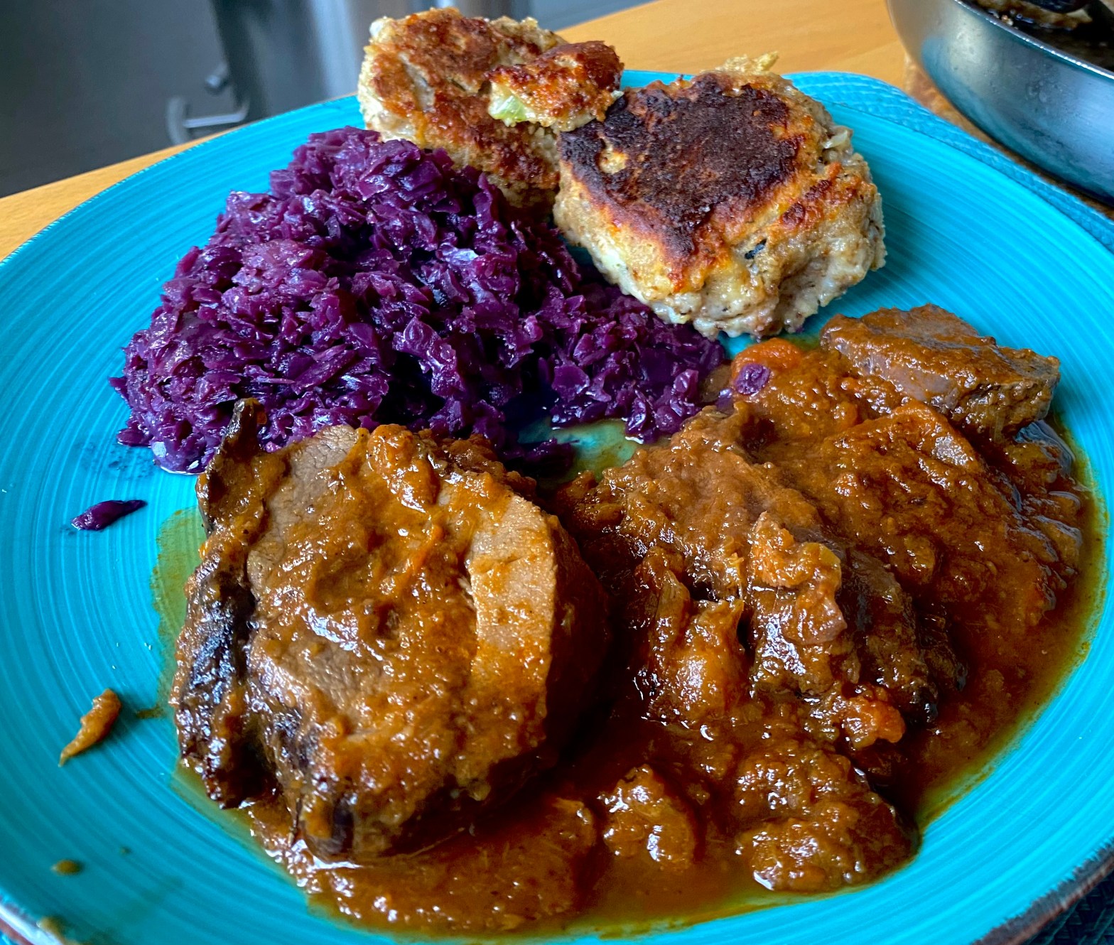 Manchmal gibt es Wildschwein auch ganz klassisch, naja bis auf die Gewürze. Eine kleine Keule (ausgelöst) scharf anbraten in Rapsöl. Tomatenmark dazugeben und ein wenig mit rösten, dann kleingeschnittenes Suppengemüse. Die Keule mit Legendary Louisiana von @Ankerkraut würzen. Mit Rotwein und Gemüsebrühe angießen und langsam köcheln lassen, ca. 2 Stunden. Die Keule ab und an umdrehen. Am Ende der Garzeit herausnehmen und die Soße pürieren und nach Geschmack mit Salz und Pfeffer abschmecken. Dazu gabs Rotkohl und herzhafte Bergkäseknödel. Die mache ich wirklich sehr gerne zu Wild, bei dem es eine Soße gibt. Das Rezept stammt aus dem Kochbuch „Heimatherd“ von @KayMasan und @JochenMönnig. Altes Brot dazu in Würfel schneiden. Butter mit Schalotten schmelzen lassen, Milch zufügen. Die etwas abgekühlte Mischung zu den Brotwürfeln geben. Einwirken lassen und kneten. Eier dazugeben, etwas Mehl und geriebenen Bergkäse. Abschmecken und in Rapsöl braten.