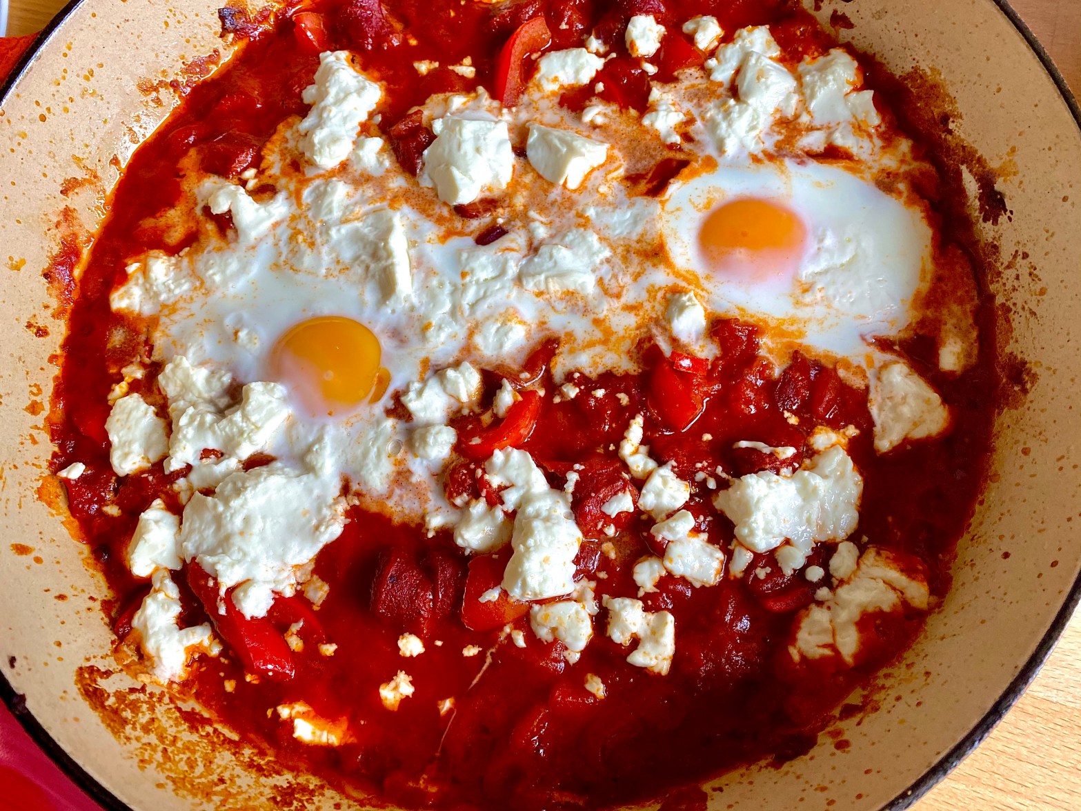 Israelisches Shakshuka – schnell gemacht und sehr lecker. Wild wird es mit in Scheiben geschnittenen Pfefferbeisser, alternativ geht auch Krakauer, beides vom Wildschwein. Für das Skakshuka eine rote Zwiebel und Knoblauch würfeln, eine kleine Chili fein hacken, eine rote Paprika in Streifen schneiden, die gewählte Wurst in Scheiben schneiden. Alles in Olivenöl anbraten für ca. 10 Minuten. Mit Paprika und Kreuzkümmel würzen, und Tomatenmark in die Pfanne geben und kurz mit anrösten. Mit einer Dose geschälte Tomaten auffüllen und ca. 10 Minuten köcheln lassen, eventuell immer mal wieder etwas Wasser nachgiessen. Den Backofen derweil vorheizen auf 190 Grad Ober/Unterhitze. Mit Salz, Pfeffer und etwas Zimt abschmecken und zwei Mulden in die Masse drücken. Dort hinein zwei frische Eier aufschlagen. Noch etwas Feta über alles bröckeln und im Ofen rund 10 Minuten garen bis die Eier gestockt sind. Dazu passt frisches Brot/Baguette.