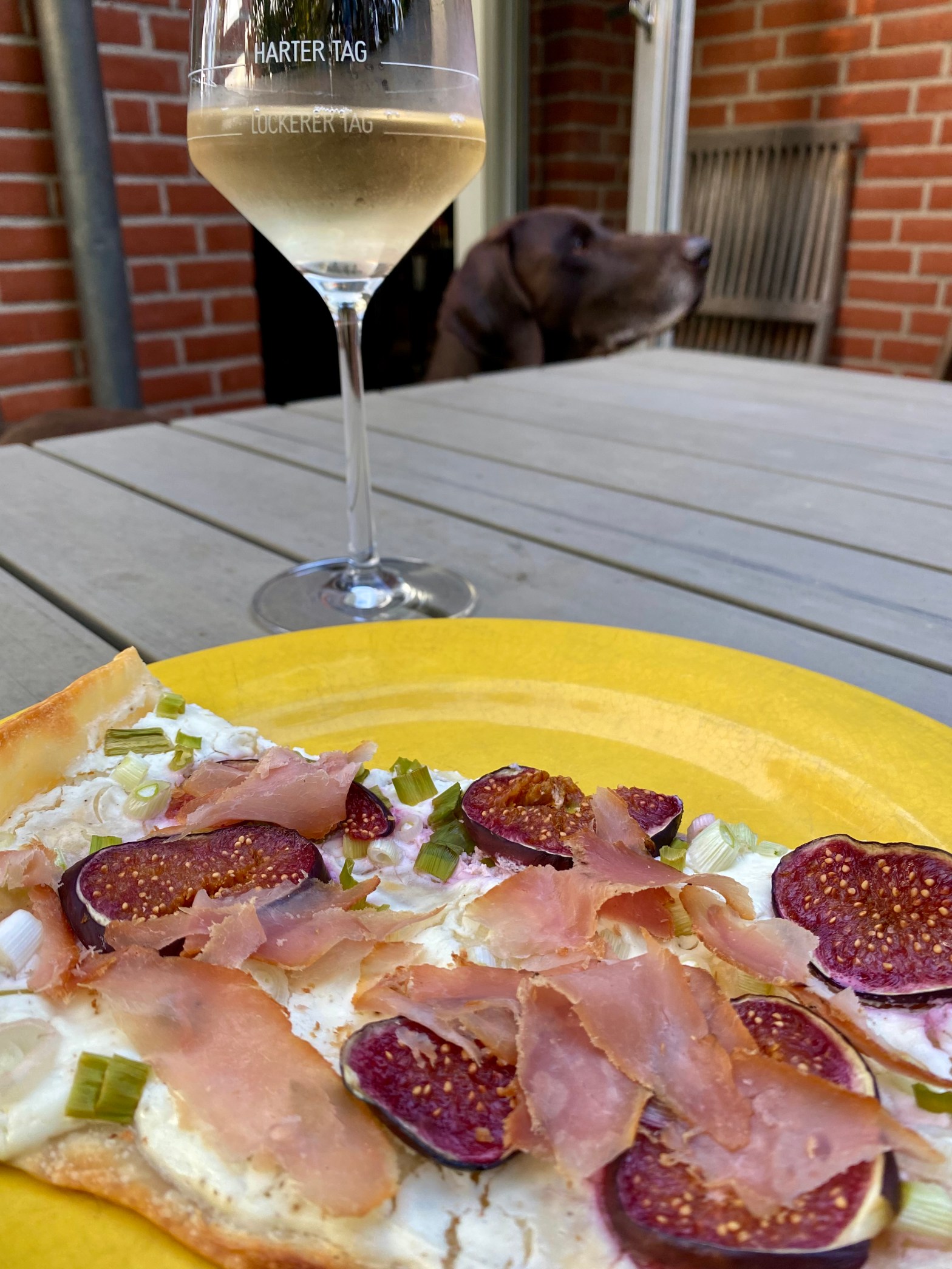 Es ist ein schnelles Essen: Flammkuchen. Ich nehme einen Fertigteig, bestreiche diesen je nach dem was der Kühlschrank hergibt. Gestern war es Ziegenfrischkäse gemischt mit Schmand, abgeschmeckt mit Salz und Pfeffer. Darauf werden in kleine Ringe geschnittene Frühlingszwiebeln verteilt, danach einige Feigen, die ich in Scheiben geschnitten habe. Nach Backanleitung auf der Teigpackung backen. Am Ende unseren selbst geräucherten Wildschwein-Lachsschinken in dünnen Scheiben darauf verteilen. Fertig. Schnelle Küche für jeden Tag – so einfach ist kochen mit Wild. Dazu einen Riesling, natürlich aus dem Rheingau. Da guckt selbst Kurzhaar Leonidas von Königsmark hungrig.