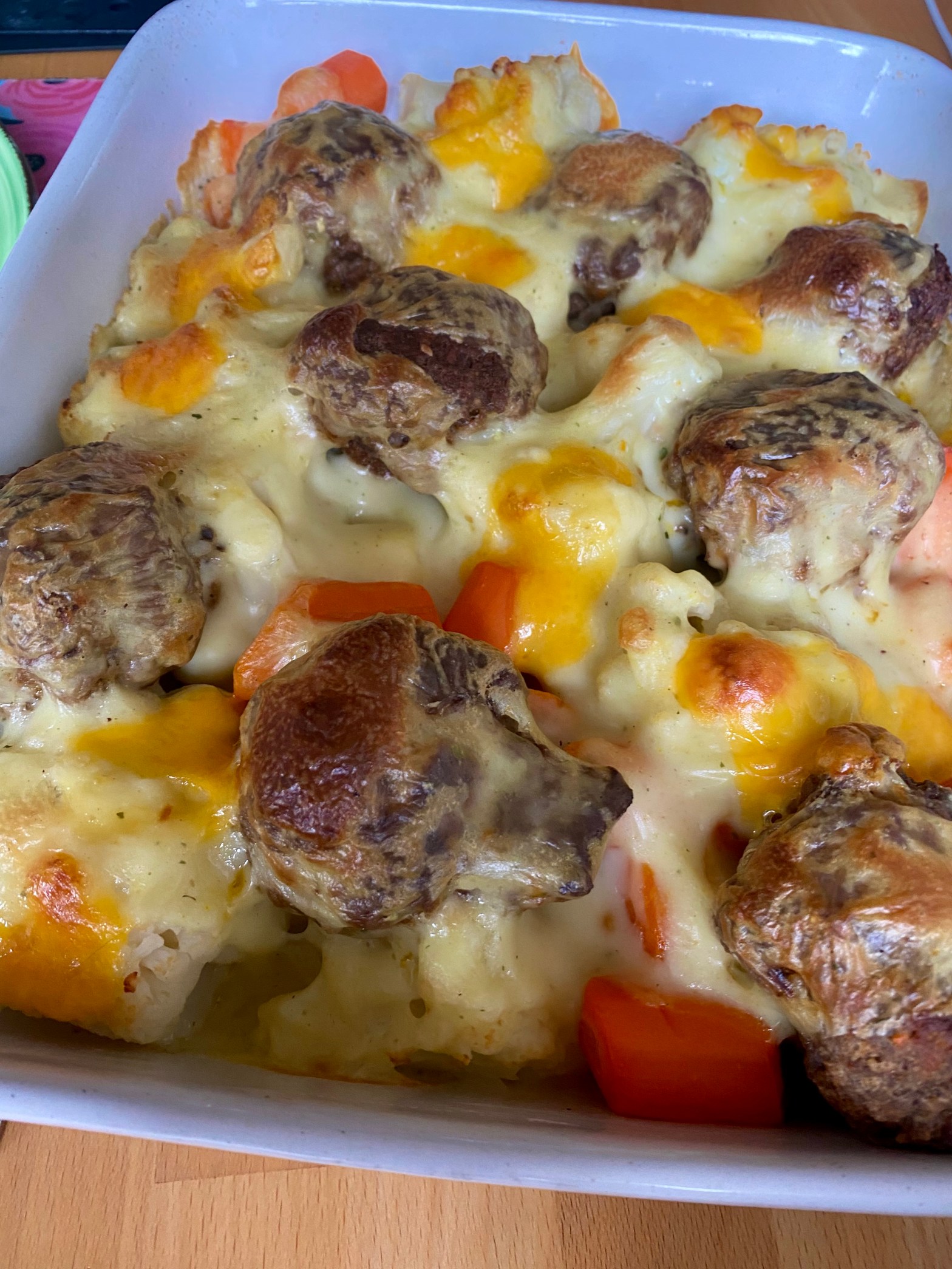 Die einfachsten Rezepte für jeden Tag sind meistens solche, in den denen Hack, hier vom Reh, verwendet werden. In den Auflaufen kommen Blumenkohl, Möhren, Frikadellen, Béchamelsoße. Und so geht es: Das Hack nach Geschmack würzen und zu kleinen Frikadellen verarbeiten. Diese werden in einer Pfanne gebraten. In der Zwischenzeit den Blumenkohl in Röschen zerteilen und diese in Salzwasser garen, nach ein paar Minuten in grobe Stücke geschnittene Möhren zugeben. Alles abgießen und mit den Frikadellen in einer gefetteten Auflaufform schichten. Zuletzt eine Béchamelsoße darüber gießen (dazu Butter schmelzen lassen, etwas Mehl daraufgeben und verrühren, mit Milch und Brühe ablöschen und mit frischem Muskat final würzen). Ein wenig Käse (was gerade im Kühlschrank ist) über den Auflauf geben und diesen bei 200 Grad/180 Grad Umluft ca. 30 Minuten backen lassen.