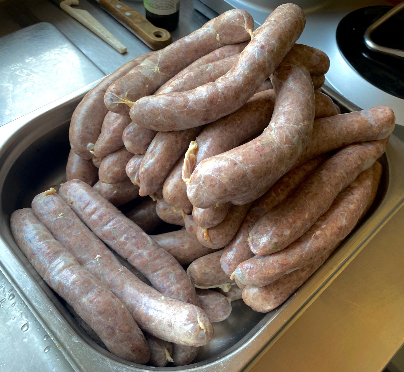 Seit Monaten wollten wir mal wieder Wildbratwürste machen, jetzt war es soweit. Verwendet wurde Reh, der Speck war noch in der Truhe vom Wildschwein. Das Rezept haben wir von einem Wurstseminar im @Spielweg Romantikhotel von Familie Fuchs im Münstertal. Für 1 kg Brät benötigt man 500 g Wild und 250 g Wildschweinbauch sowie 250 g Hausschweinbauch. Da wir noch schieren Wildschweinspeck hatten, haben wir das Rezept abgewandelt und 750 g Reh sowie 250 g Wildschweinspeck genommen. Alles wird durch den Fleischwolf gejagt und dann kommen dazu 20 g Kochsalz, 3 g Pfeffer, 1 g Muskatblüte, eine Prise Kümmel, 1 Prise Zucker, Abrieb einer Zitrone, 1 Zehe Knoblauch. Statt 2 – 3 g Majoran hab ich frischen Thymian, Zitronenthymian und Rosmarin fein gehackt genommen. Im Original steht auch noch 1 g Koriander, hab ich nicht, daher weggelassen. Alles gut vermengen und dann mittels Wursttülle in den Darm abfüllen. Wie man sieht, waren wir etwas ausser Übung. Nun ja – entscheidend ist ja der Geschmack!