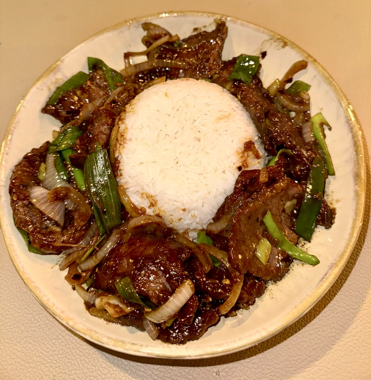 Fein, wenn man eine Schwiegertochter hat, die gut kochen kann. Danke Alina für dieses tolle Rezept! Und so hat sie es gemacht: Den Damwildrücken in feine Streifen schneiden und diese einlegen in eine Sauce aus 2 Tl Weißweinessig, 1 Tl Salz, 2 Tl Sesamöl. Das Fleisch hineingeben und gut umrühren, dass alles benetzt ist. Dann ordentlich Speisestärke über alles streuen und wieder durchrühren. Fleisch scharf anbraten, dann wieder raus aus Wok oder Pfanne. Weiße Zwiebeln und Frühlingszwiebeln, klein geschnitten, in den Wok o. Pfanne, kurz anbraten, Fleisch wieder dazu geben. Folgende Soße darüber geben: 2 El dunkle Soya Sauce, 2 El Weißweinessig, 4 kleingehackte Koblauchzehen, 1 Tl schwarzer Pfeffer, 1 El Chiliflocken, 2 El Fischsauce, 1 El brauner Zucker. Alles kurz köcheln lassen. Dazu Basmati-Reis.